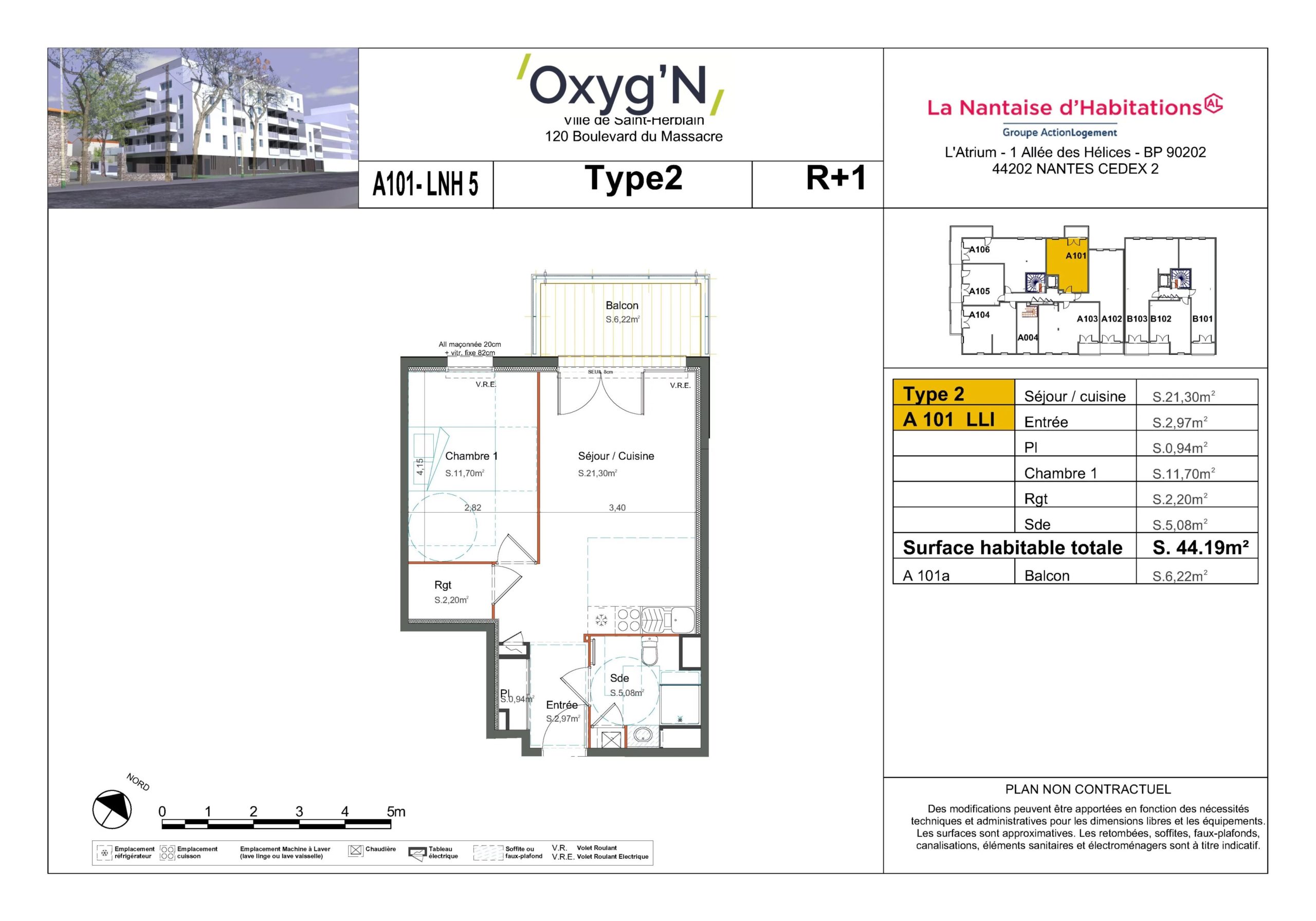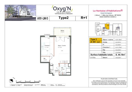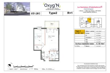 A louer, 1 appartement neuf de type 2, avec une surface habitable de 44.19 m² au cœur d’une résidence située 120 Bd du Massacre à Saint Herblain.